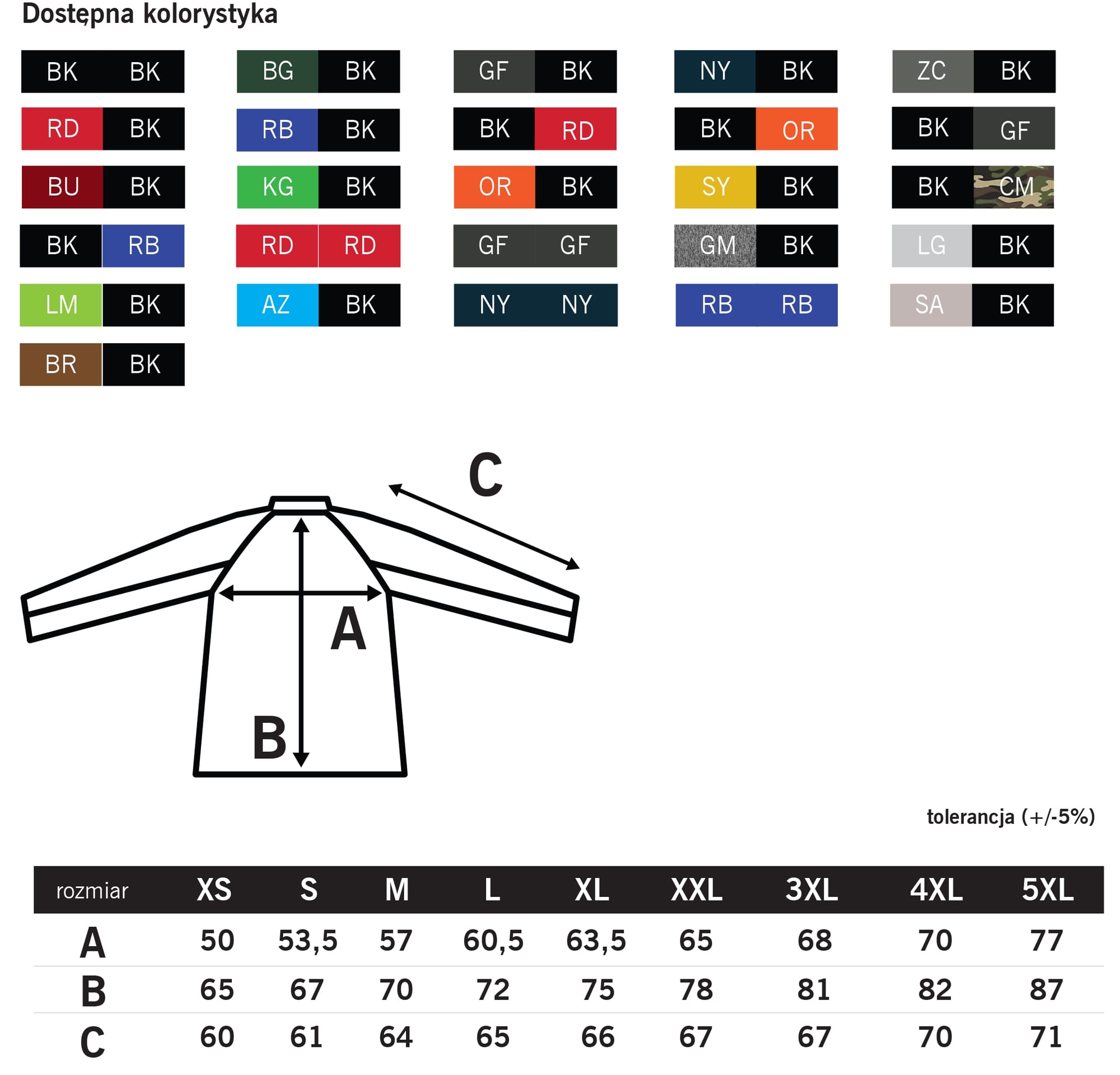 Bluza wykonana z POLARU ( NIE MIKROPOLARU). Polar jest gruby i posiada bardzo dobre własciwosci cieplne, przyjemny w dotyku, 2 kieszenie zasuwane zamkami błyskawicznymi oraz dodatkowa kieszen na piersi na zamek. Bluza na karku, barkach i łokciach posiada wzmocnienia. Mozliwe zastosowanie dowolnej kolorystyki i łaczenia kolorów. Skład: 100% poliester. Gramatura: 340 gr.- 360 gr Rozmiary: XS / S / M / L / XL / XXL / 3XL / 4XL / 5XL